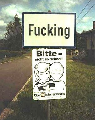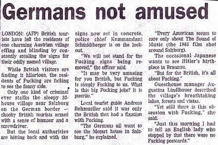 This newspaper clipping is funnier than the signs:These are signs at the edge of the town limits.