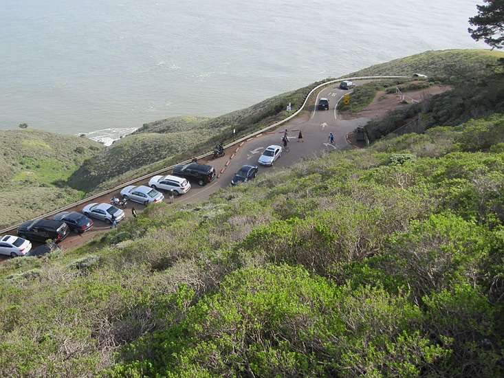 A view of the headlands, the winding road ahead, and Fort Cronkhite in the distance.
