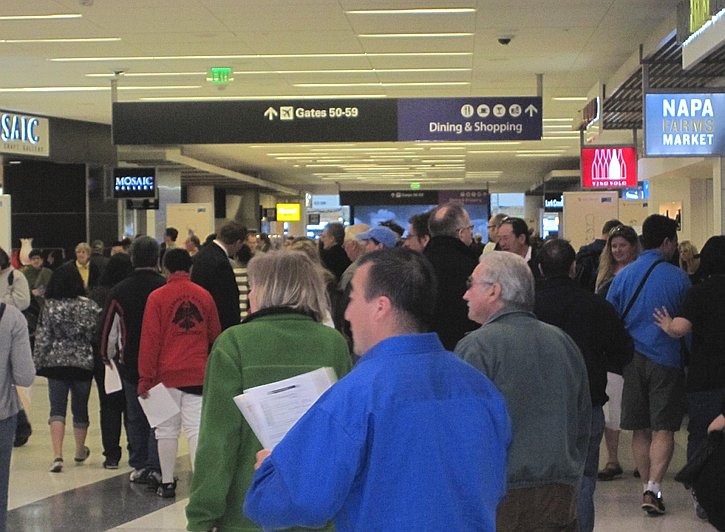 Overview of the Terminal 2 lobby looking toward the entrances. Note the