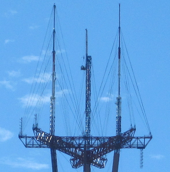 | A close up shot showing the newly installed KOFY antenna and the crew platform on the west mast and the KBCW 45 antenna on the south east mast across from the platform. |